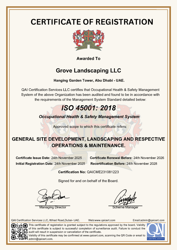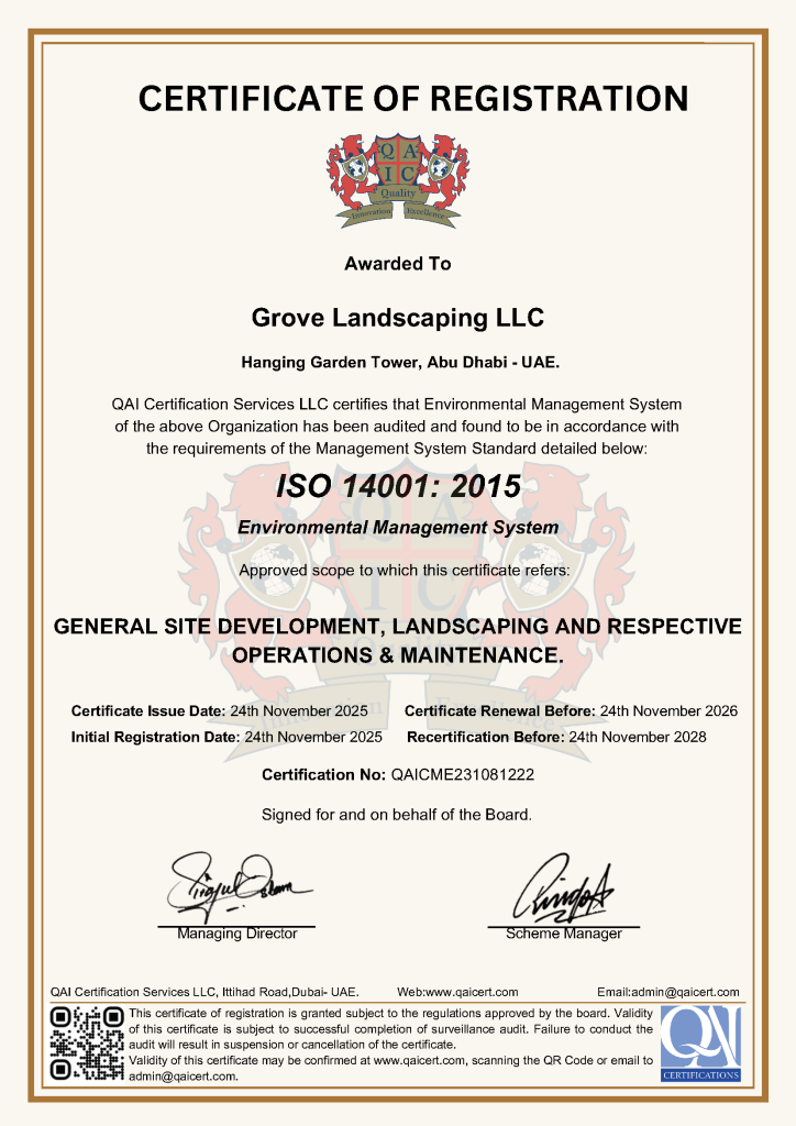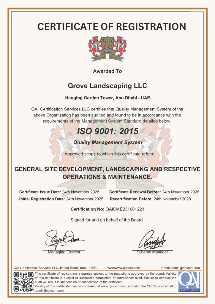 Grove Landscaping LLC is a premier Landscape company dedicated to crafting captivating and sustainable outdoor spaces across the United Arab Emirates, bringing our expertise to cities such as Abu Dhabi, Al Ain, Dubai and beyond. We have a proven track record of successfully completing projects of various scales, from private residences and luxury resorts to commercial developments and public spaces .